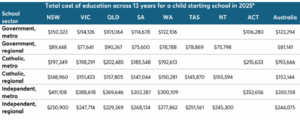 If you’re considering private school options, school fees are a major cost and have trended faster than the rate of inflation. Additionally, there’s uniforms, textbooks, extra-curricular activities and trips – that also need to be factored throughout the 13-year school journey. It’s also worth considering how the costs compare across school sectors if you are in two minds about school type.